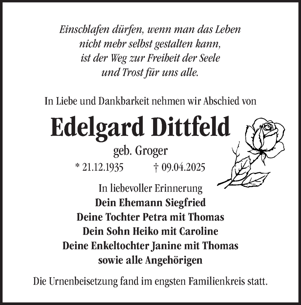 Hier finden Sie alle Traueranzeigen aus der Zeitung, die bisher für Edelgard Dittfeld erschienen sind. Weitere Traueranzeigen, die in der Zeitung erscheinen, werden hier ebenfalls aufgelistet