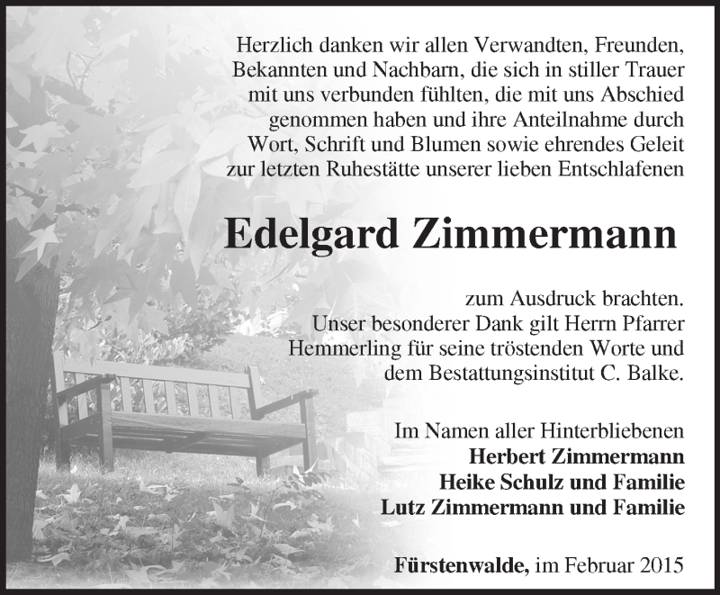 Hier finden Sie alle Traueranzeigen aus der Zeitung, die bisher für Edelgard Zimmermann erschienen sind. Weitere Traueranzeigen, die in der Zeitung erscheinen, werden hier ebenfalls aufgelistet