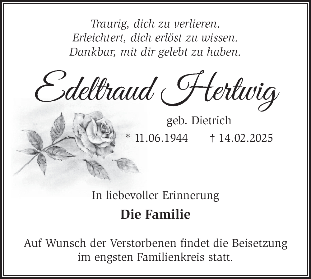 Hier finden Sie alle Traueranzeigen aus der Zeitung, die bisher für Edeltraud Hertwig erschienen sind. Weitere Traueranzeigen, die in der Zeitung erscheinen, werden hier ebenfalls aufgelistet