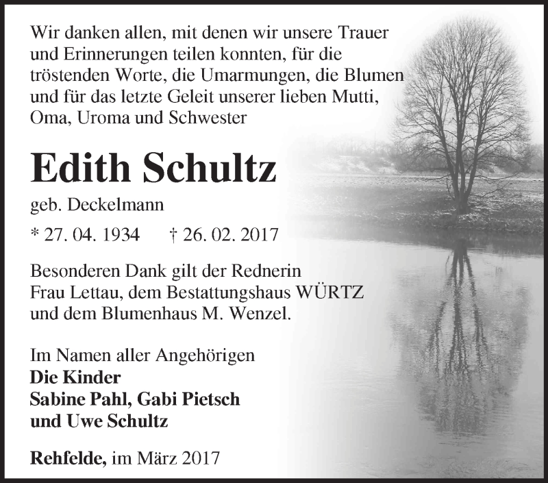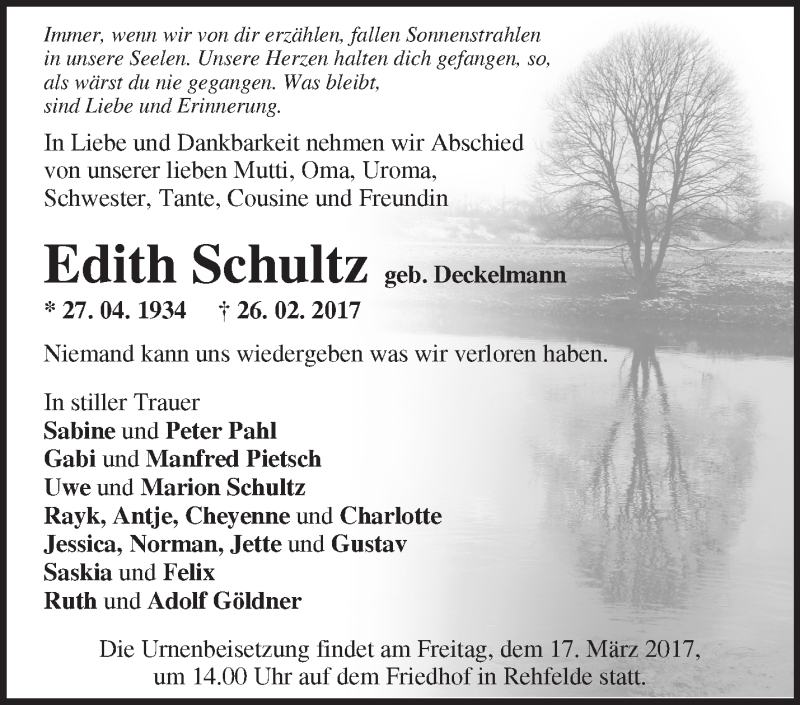 Hier finden Sie alle Traueranzeigen aus der Zeitung, die bisher für Edith Schultz erschienen sind. Weitere Traueranzeigen, die in der Zeitung erscheinen, werden hier ebenfalls aufgelistet