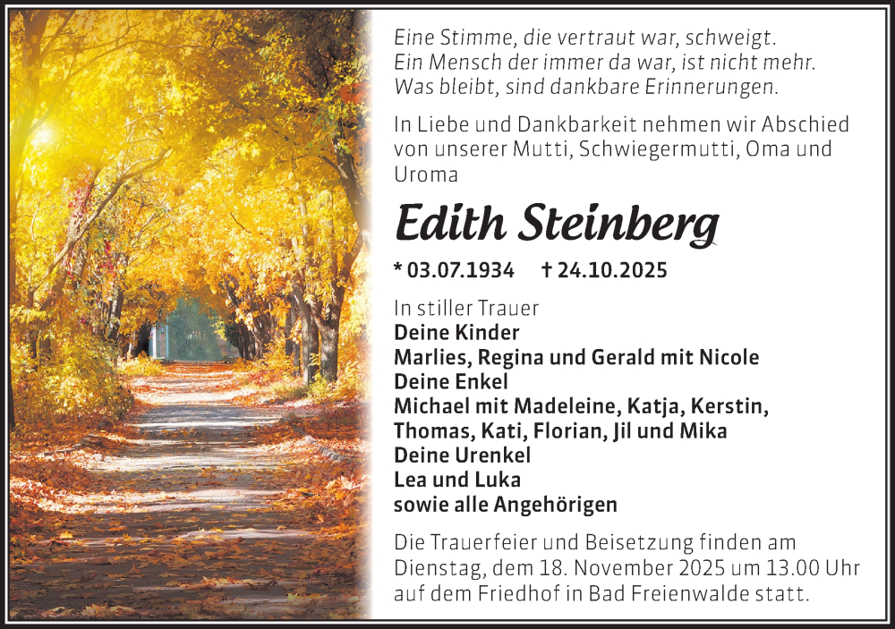 Hier finden Sie alle Traueranzeigen aus der Zeitung, die bisher für Edith Steinberg erschienen sind. Weitere Traueranzeigen, die in der Zeitung erscheinen, werden hier ebenfalls aufgelistet