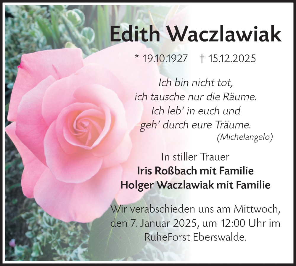 Hier finden Sie alle Traueranzeigen aus der Zeitung, die bisher für Edith Waczlawiak erschienen sind. Weitere Traueranzeigen, die in der Zeitung erscheinen, werden hier ebenfalls aufgelistet