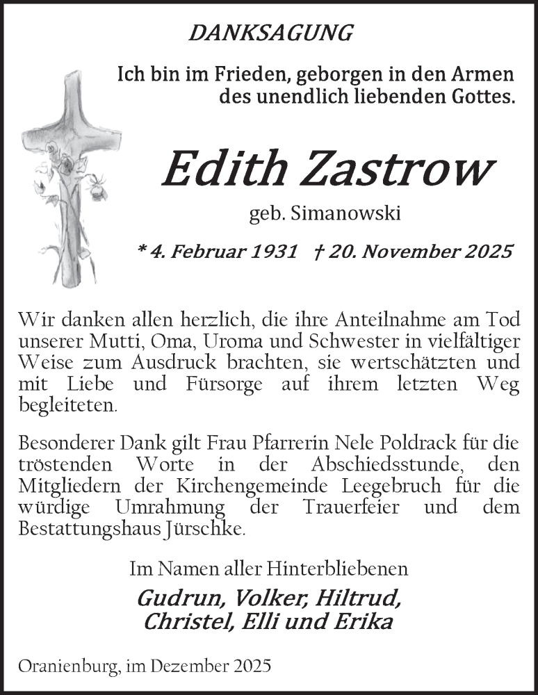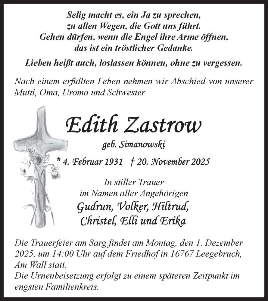 Hier finden Sie alle Traueranzeigen aus der Zeitung, die bisher für Edith Zastrow erschienen sind. Weitere Traueranzeigen, die in der Zeitung erscheinen, werden hier ebenfalls aufgelistet