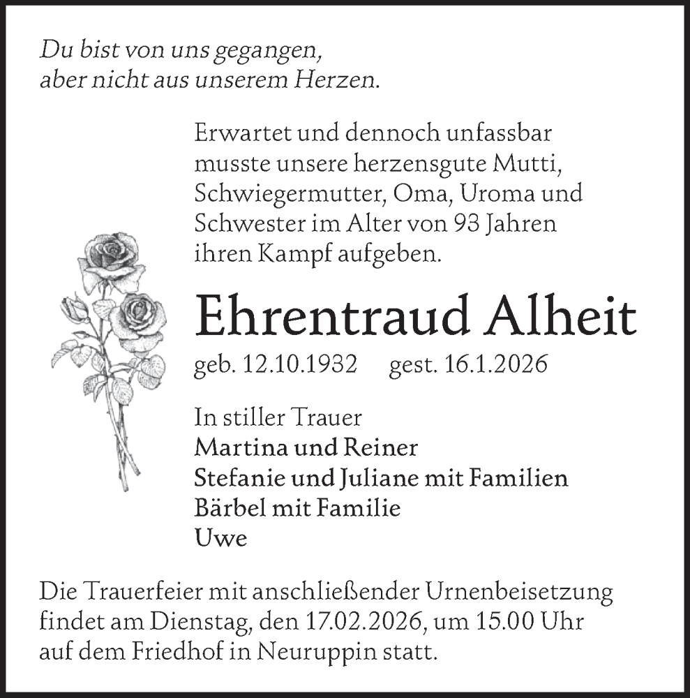 Hier finden Sie alle Traueranzeigen aus der Zeitung, die bisher für Ehrentraud Alheit erschienen sind. Weitere Traueranzeigen, die in der Zeitung erscheinen, werden hier ebenfalls aufgelistet