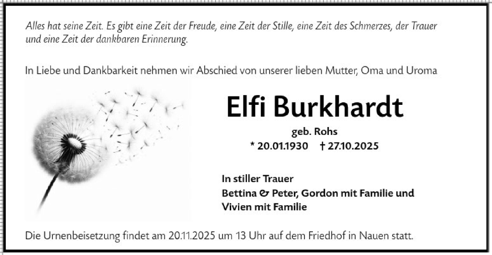 Hier finden Sie alle Traueranzeigen aus der Zeitung, die bisher für Elfi Burkhardt erschienen sind. Weitere Traueranzeigen, die in der Zeitung erscheinen, werden hier ebenfalls aufgelistet