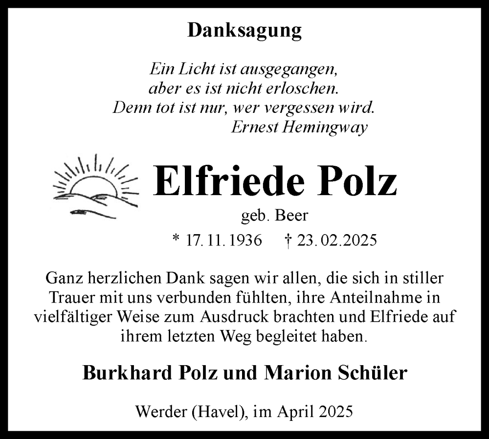 Hier finden Sie alle Traueranzeigen aus der Zeitung, die bisher für Elfriede Polz erschienen sind. Weitere Traueranzeigen, die in der Zeitung erscheinen, werden hier ebenfalls aufgelistet