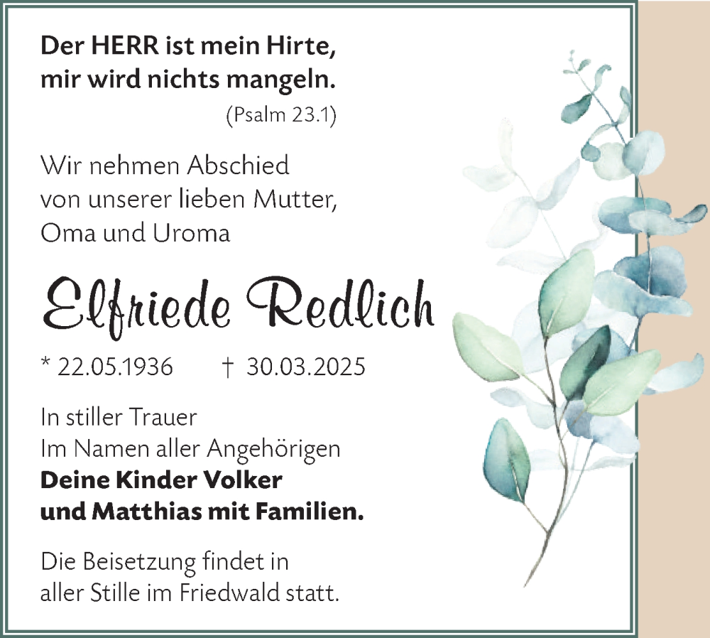 Hier finden Sie alle Traueranzeigen aus der Zeitung, die bisher für Elfriede Redlich erschienen sind. Weitere Traueranzeigen, die in der Zeitung erscheinen, werden hier ebenfalls aufgelistet