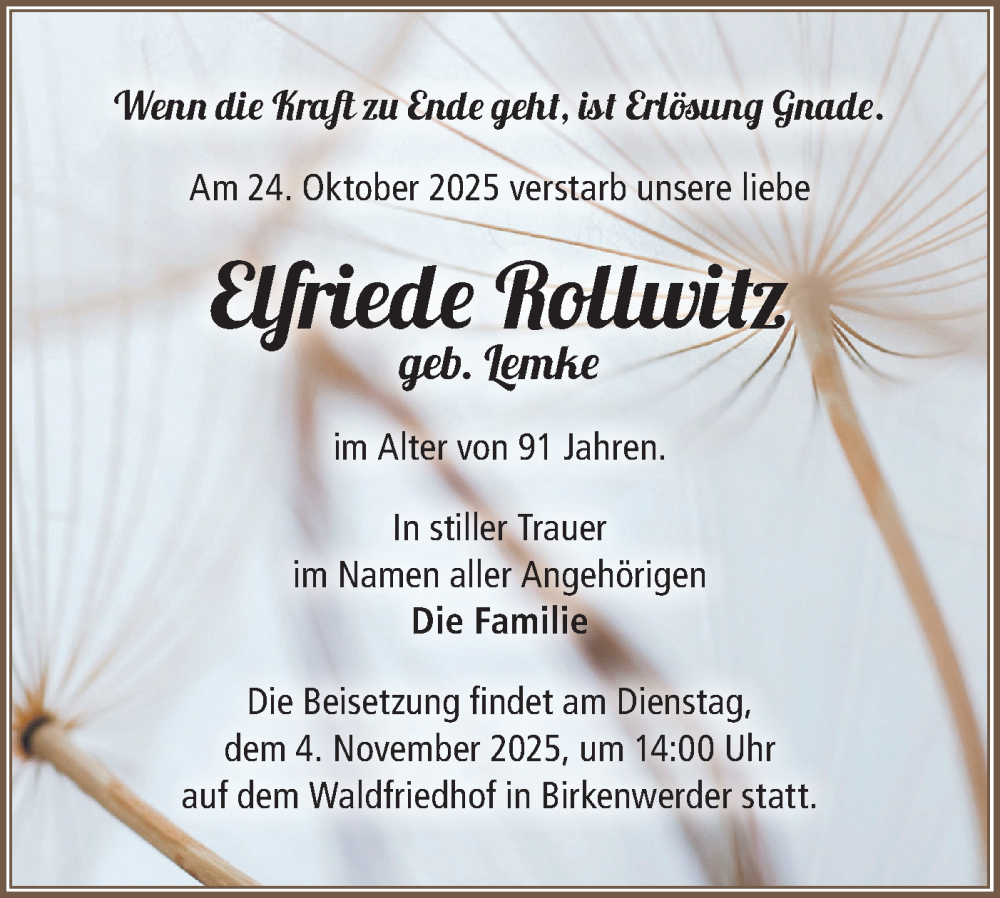 Hier finden Sie alle Traueranzeigen aus der Zeitung, die bisher für Elfriede Rollwitz erschienen sind. Weitere Traueranzeigen, die in der Zeitung erscheinen, werden hier ebenfalls aufgelistet