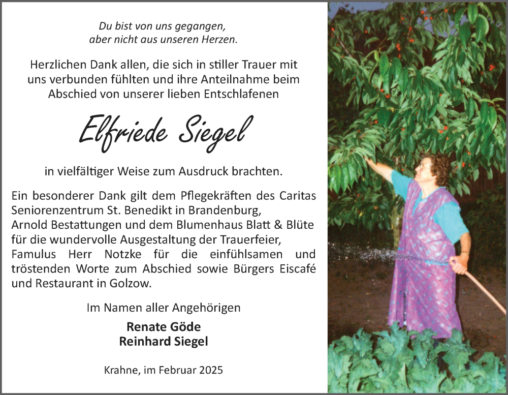 Hier finden Sie alle Traueranzeigen aus der Zeitung, die bisher für Elfriede Siegel erschienen sind. Weitere Traueranzeigen, die in der Zeitung erscheinen, werden hier ebenfalls aufgelistet