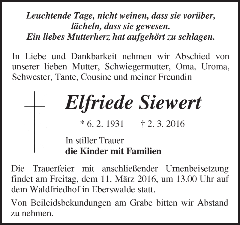 Hier finden Sie alle Traueranzeigen aus der Zeitung, die bisher für Elfriede Siewert erschienen sind. Weitere Traueranzeigen, die in der Zeitung erscheinen, werden hier ebenfalls aufgelistet