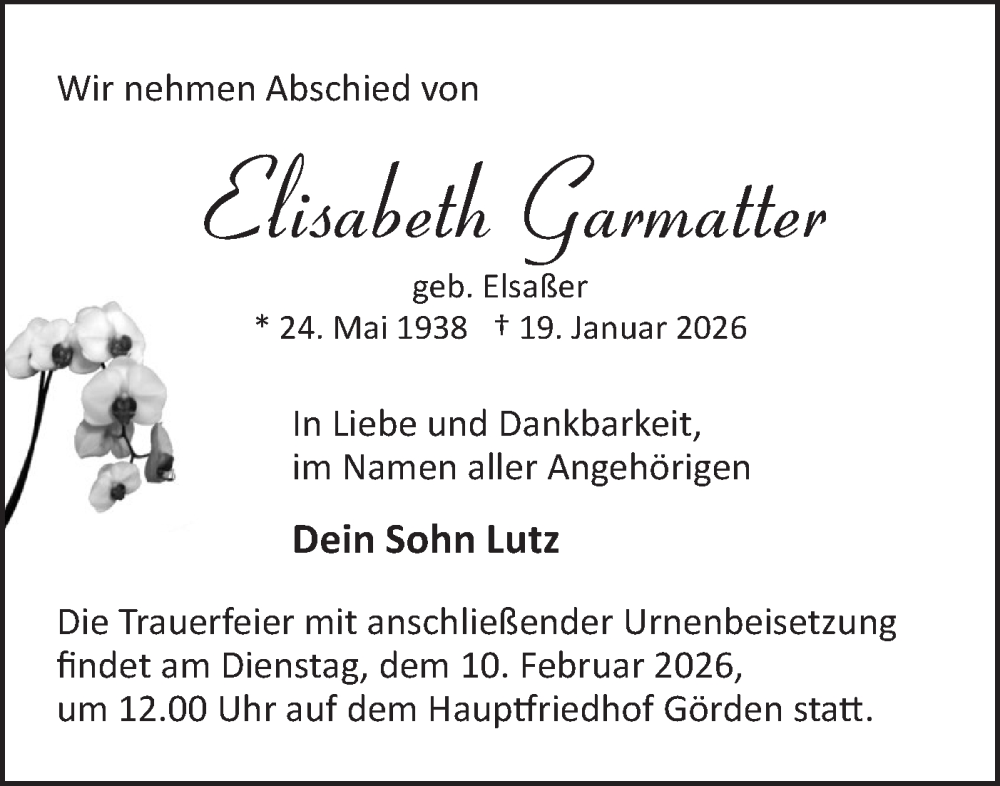 Hier finden Sie alle Traueranzeigen aus der Zeitung, die bisher für Elisabeth Garmatter erschienen sind. Weitere Traueranzeigen, die in der Zeitung erscheinen, werden hier ebenfalls aufgelistet