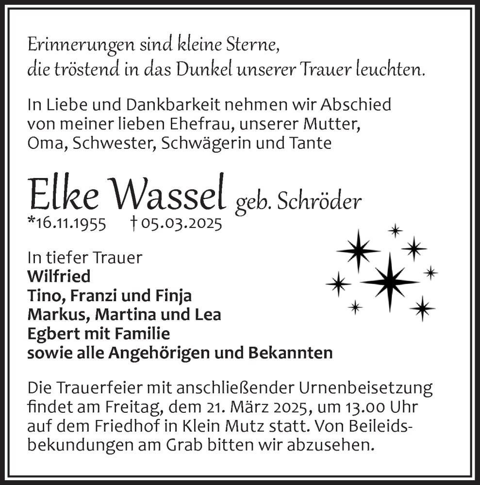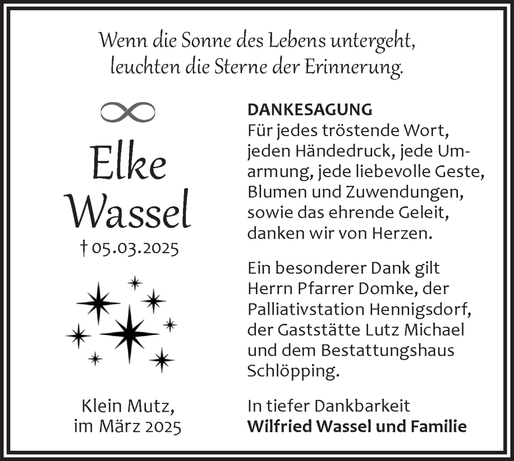 Hier finden Sie alle Traueranzeigen aus der Zeitung, die bisher für Elke Wassel erschienen sind. Weitere Traueranzeigen, die in der Zeitung erscheinen, werden hier ebenfalls aufgelistet