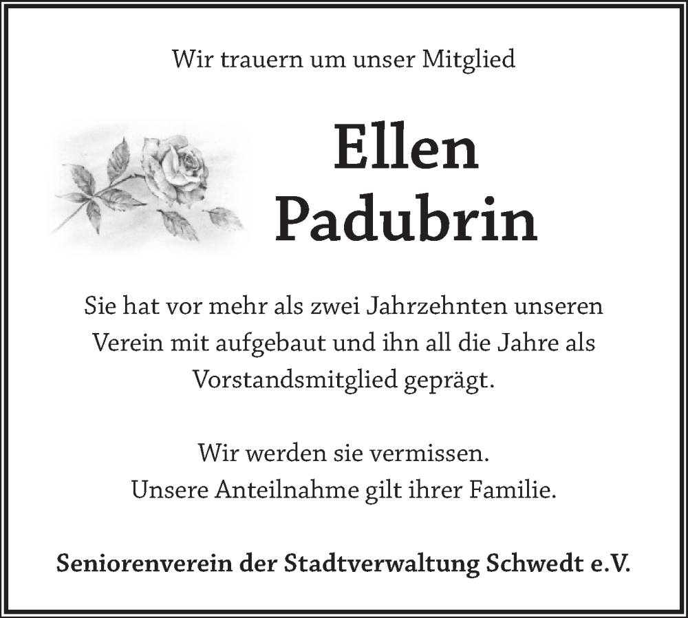 Hier finden Sie alle Traueranzeigen aus der Zeitung, die bisher für Ellen Padubrin erschienen sind. Weitere Traueranzeigen, die in der Zeitung erscheinen, werden hier ebenfalls aufgelistet