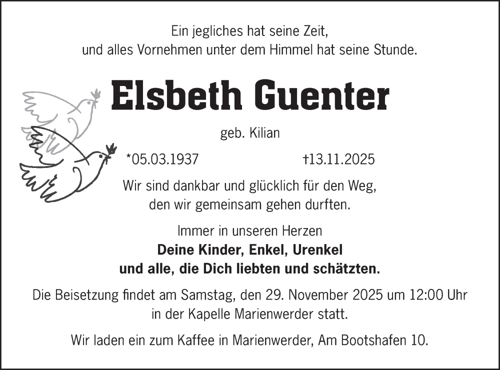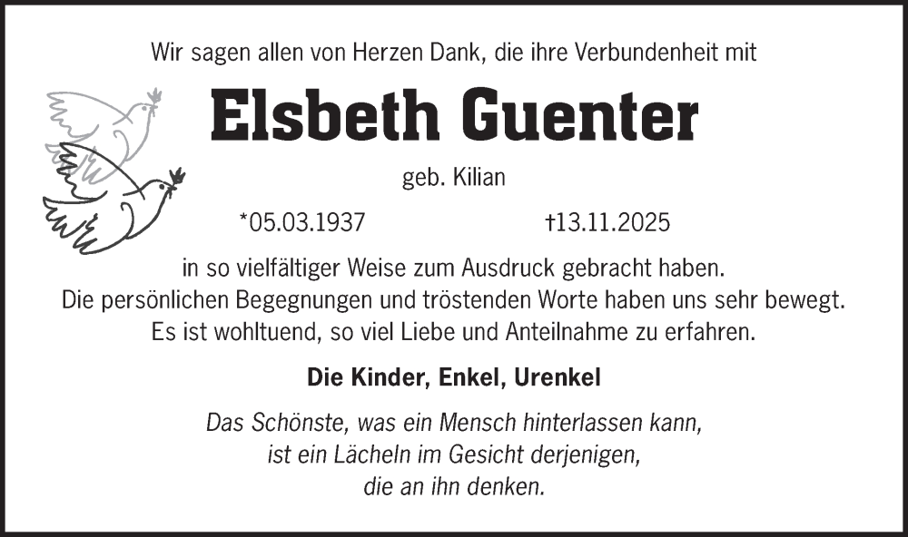 Hier finden Sie alle Traueranzeigen aus der Zeitung, die bisher für Elsbeth Guenter erschienen sind. Weitere Traueranzeigen, die in der Zeitung erscheinen, werden hier ebenfalls aufgelistet