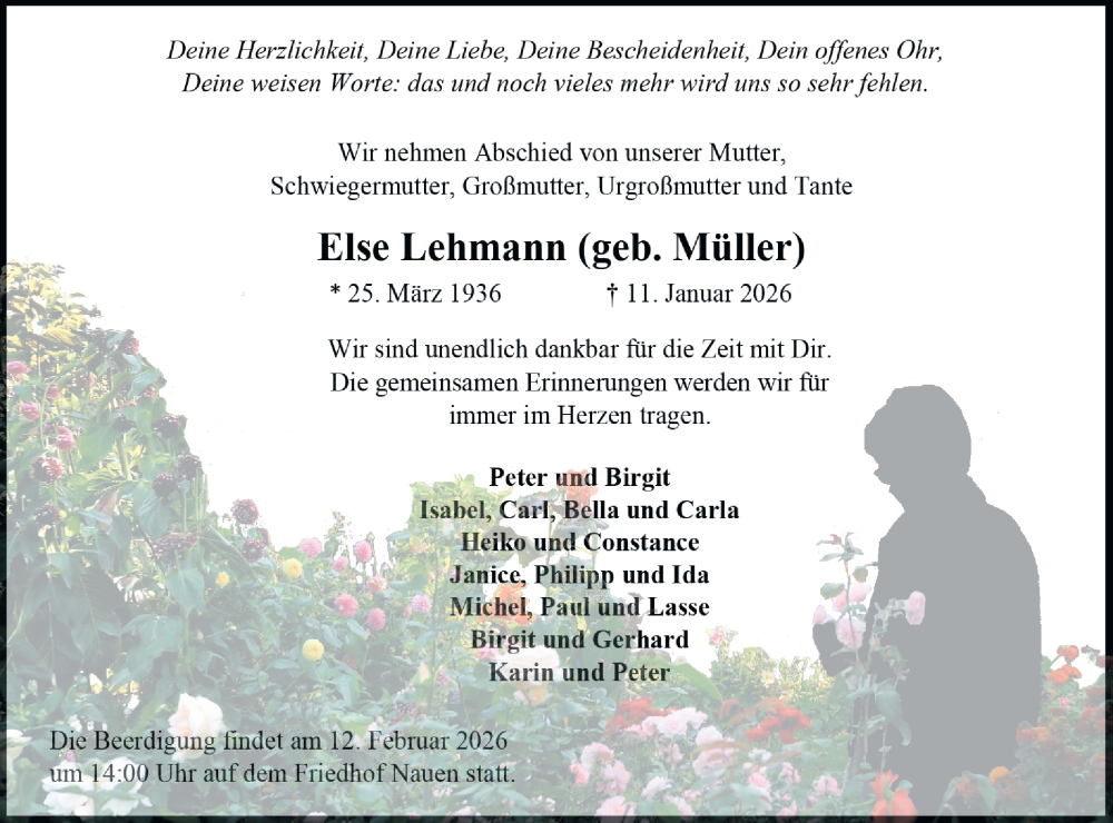 Hier finden Sie alle Traueranzeigen aus der Zeitung, die bisher für Else Lehmann erschienen sind. Weitere Traueranzeigen, die in der Zeitung erscheinen, werden hier ebenfalls aufgelistet