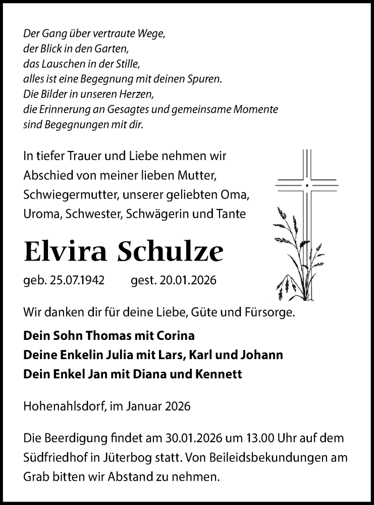 Hier finden Sie alle Traueranzeigen aus der Zeitung, die bisher für Elvira Schulze erschienen sind. Weitere Traueranzeigen, die in der Zeitung erscheinen, werden hier ebenfalls aufgelistet