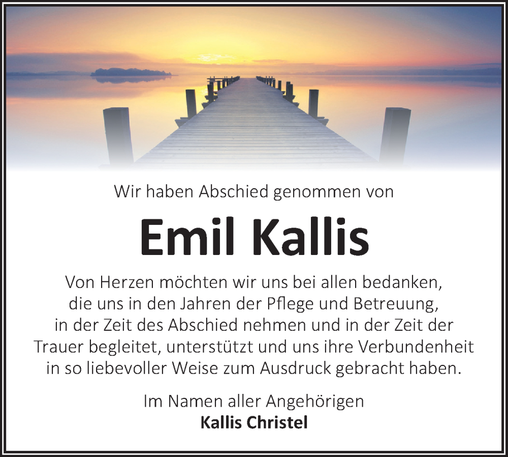 Hier finden Sie alle Traueranzeigen aus der Zeitung, die bisher für Emil Kallis erschienen sind. Weitere Traueranzeigen, die in der Zeitung erscheinen, werden hier ebenfalls aufgelistet