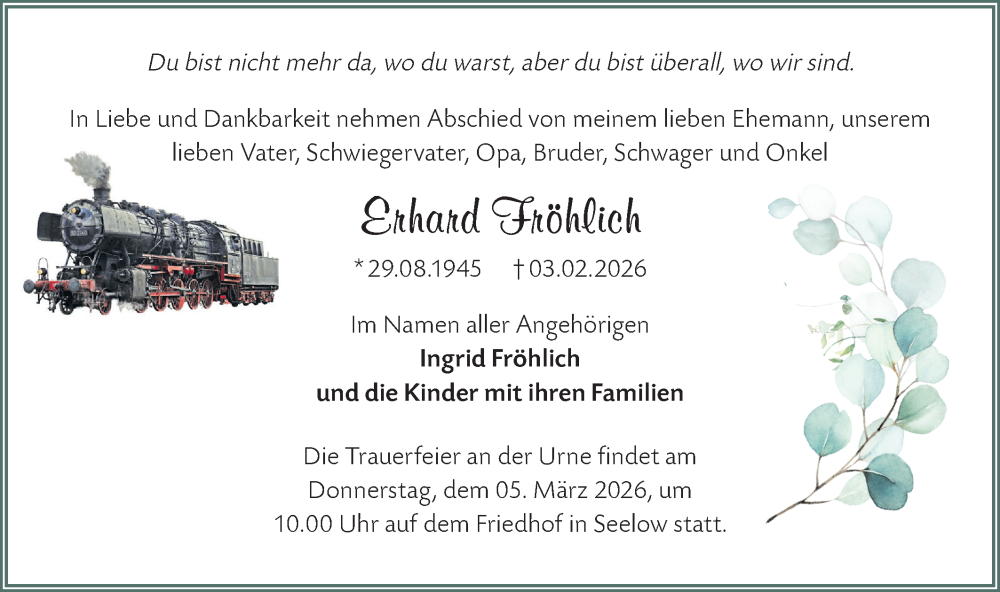 Hier finden Sie alle Traueranzeigen aus der Zeitung, die bisher für Erhard Fröhlich erschienen sind. Weitere Traueranzeigen, die in der Zeitung erscheinen, werden hier ebenfalls aufgelistet