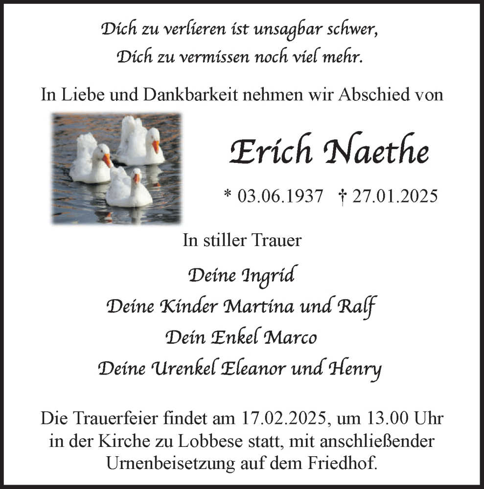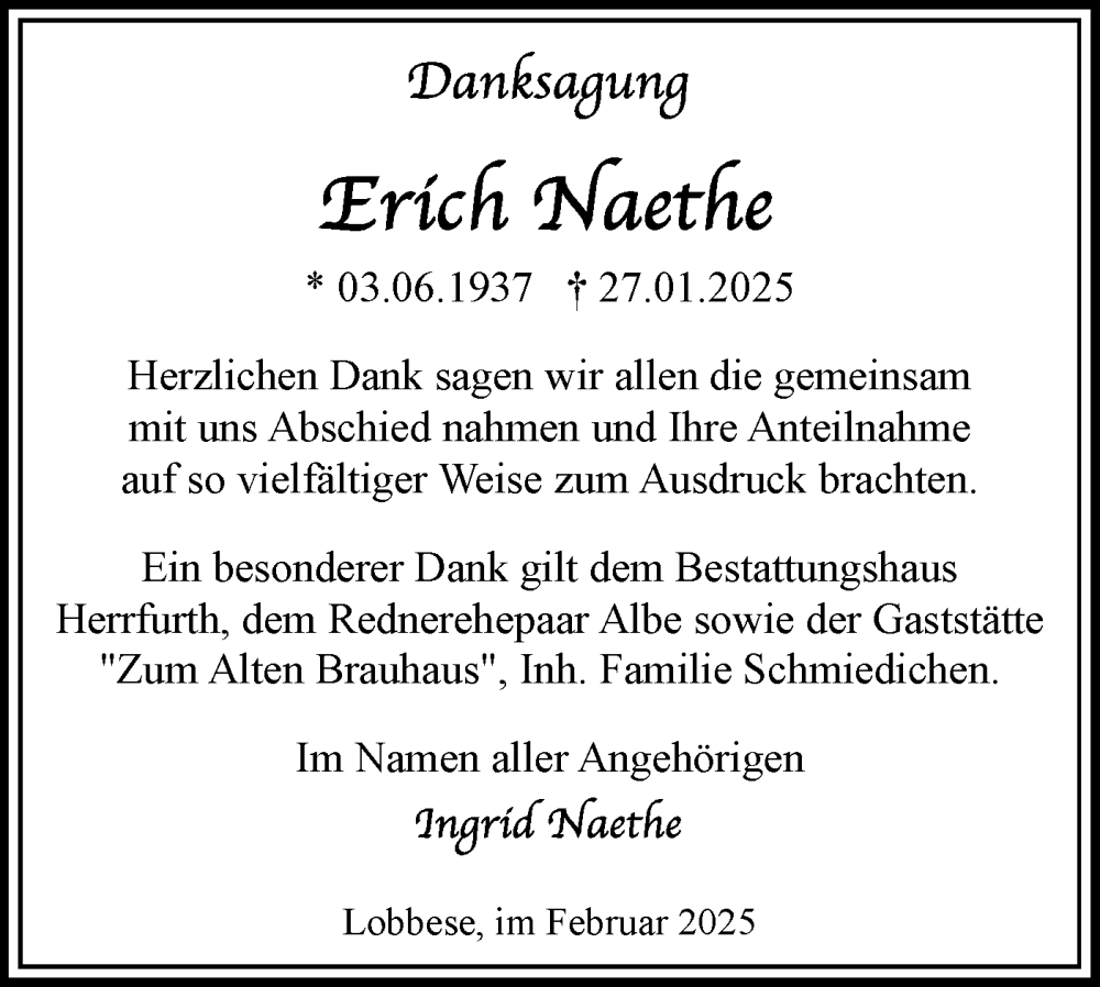 Hier finden Sie alle Traueranzeigen aus der Zeitung, die bisher für Erich Naethe erschienen sind. Weitere Traueranzeigen, die in der Zeitung erscheinen, werden hier ebenfalls aufgelistet