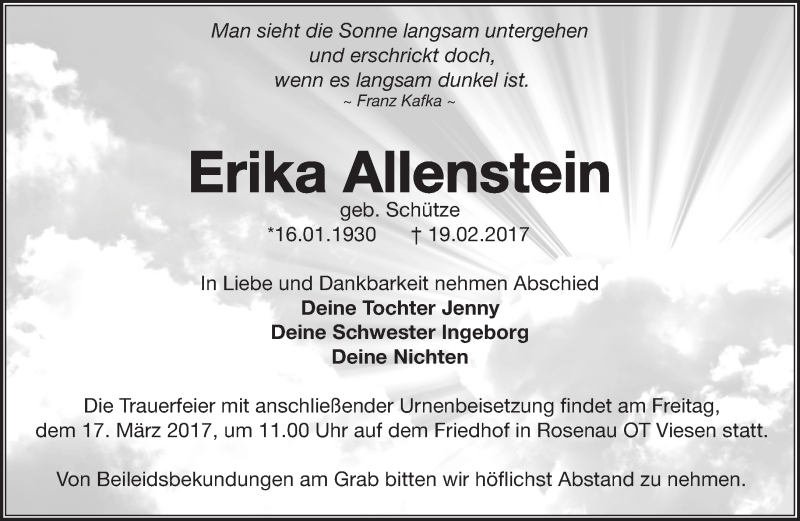 Hier finden Sie alle Traueranzeigen aus der Zeitung, die bisher für Erika Allenstein erschienen sind. Weitere Traueranzeigen, die in der Zeitung erscheinen, werden hier ebenfalls aufgelistet