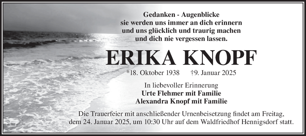 Hier finden Sie alle Traueranzeigen aus der Zeitung, die bisher für Erika Knopf erschienen sind. Weitere Traueranzeigen, die in der Zeitung erscheinen, werden hier ebenfalls aufgelistet