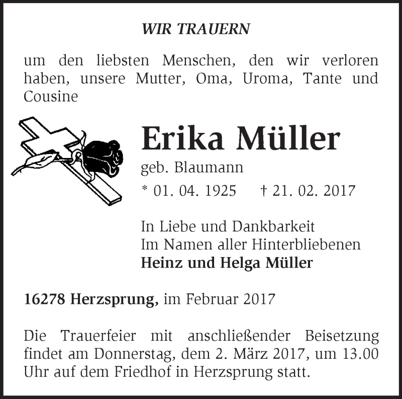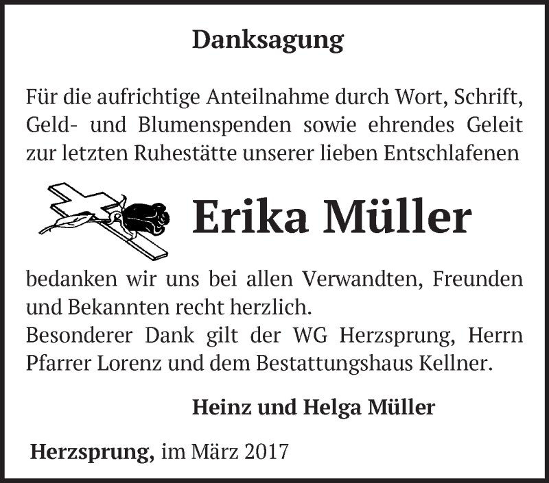 Hier finden Sie alle Traueranzeigen aus der Zeitung, die bisher für Erika Müller erschienen sind. Weitere Traueranzeigen, die in der Zeitung erscheinen, werden hier ebenfalls aufgelistet