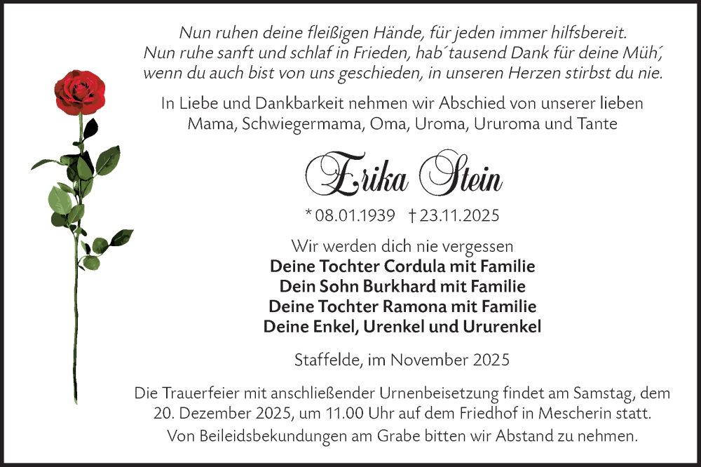 Hier finden Sie alle Traueranzeigen aus der Zeitung, die bisher für Erika Stein erschienen sind. Weitere Traueranzeigen, die in der Zeitung erscheinen, werden hier ebenfalls aufgelistet