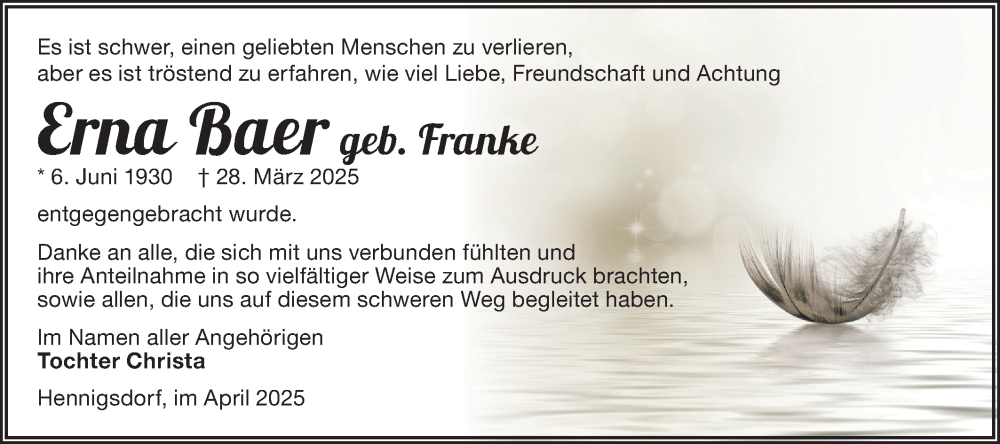 Hier finden Sie alle Traueranzeigen aus der Zeitung, die bisher für Erna Baer erschienen sind. Weitere Traueranzeigen, die in der Zeitung erscheinen, werden hier ebenfalls aufgelistet