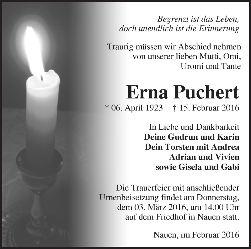 Hier finden Sie alle Traueranzeigen aus der Zeitung, die bisher für Erna Puchert erschienen sind. Weitere Traueranzeigen, die in der Zeitung erscheinen, werden hier ebenfalls aufgelistet