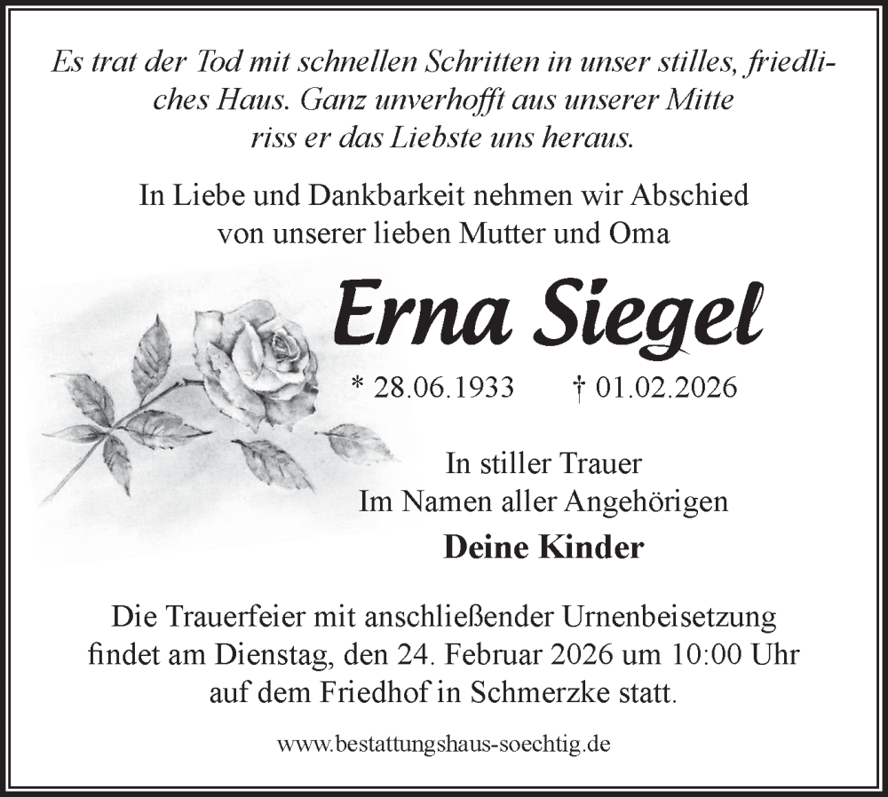 Hier finden Sie alle Traueranzeigen aus der Zeitung, die bisher für Erna Siegel erschienen sind. Weitere Traueranzeigen, die in der Zeitung erscheinen, werden hier ebenfalls aufgelistet