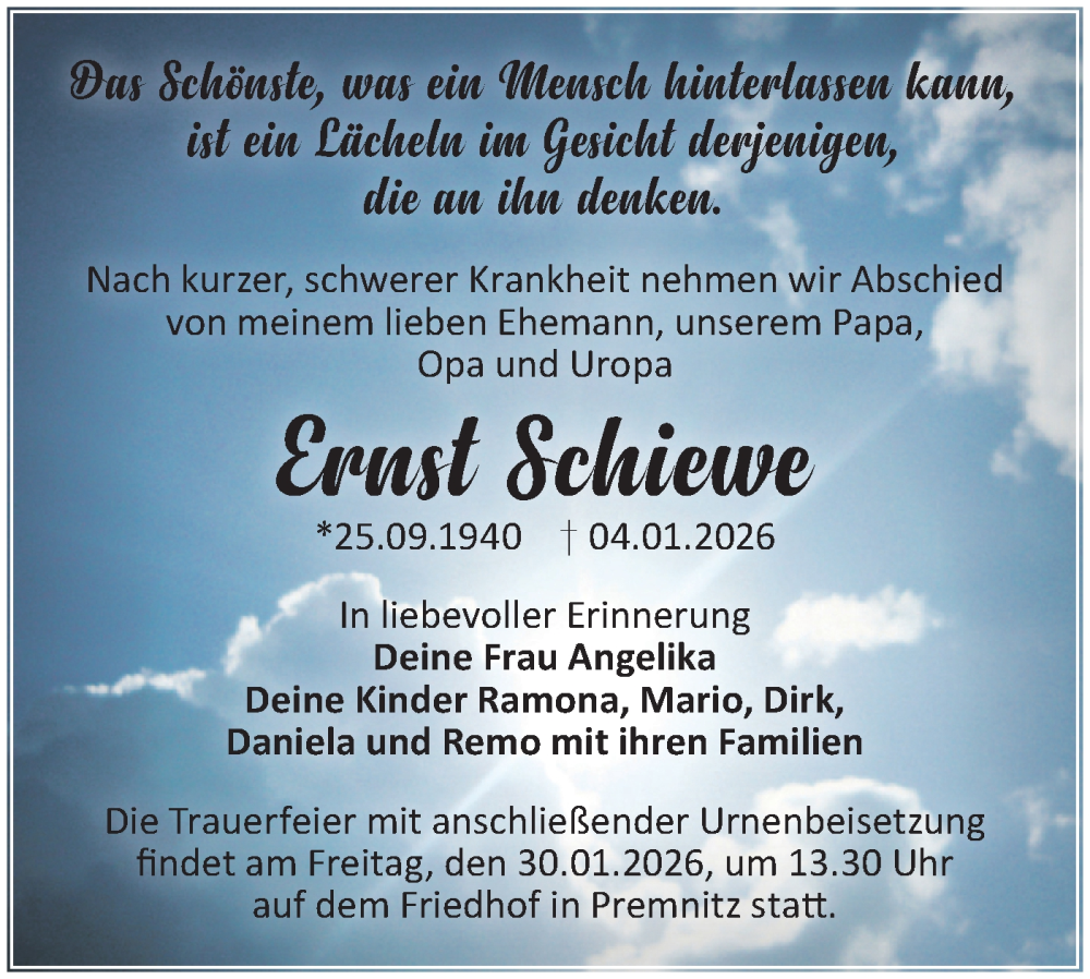 Hier finden Sie alle Traueranzeigen aus der Zeitung, die bisher für Ernst Schiewe erschienen sind. Weitere Traueranzeigen, die in der Zeitung erscheinen, werden hier ebenfalls aufgelistet