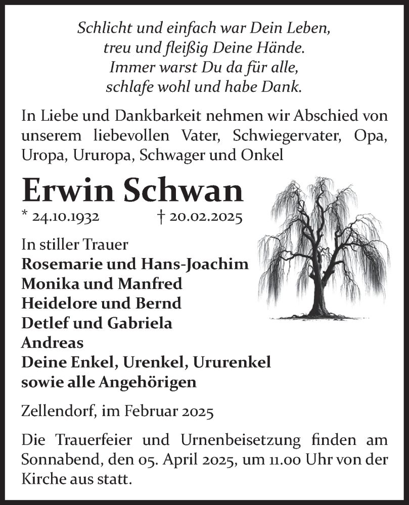 Hier finden Sie alle Traueranzeigen aus der Zeitung, die bisher für Erwin Schwan erschienen sind. Weitere Traueranzeigen, die in der Zeitung erscheinen, werden hier ebenfalls aufgelistet