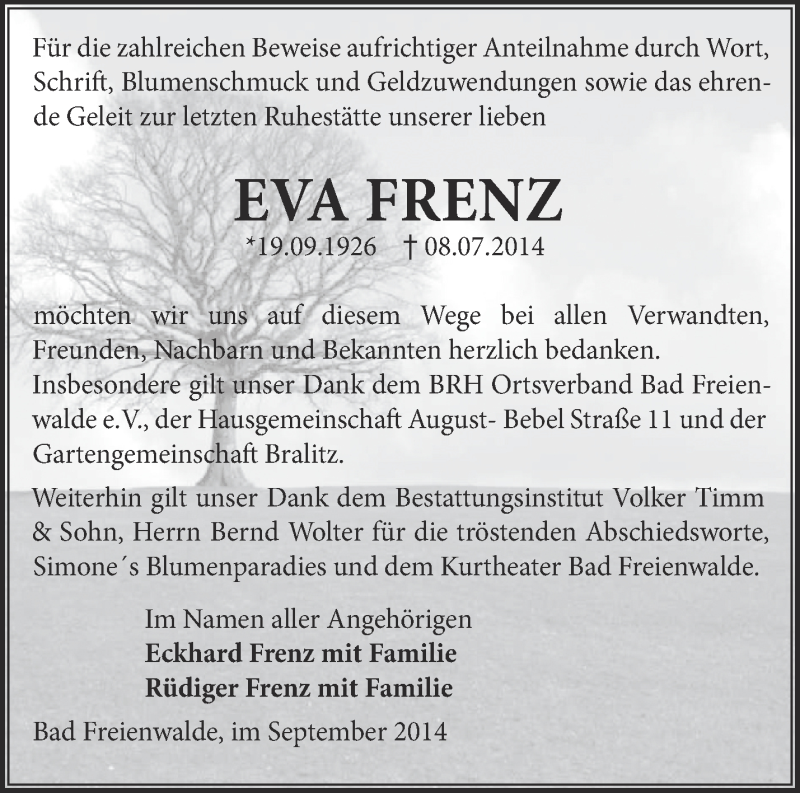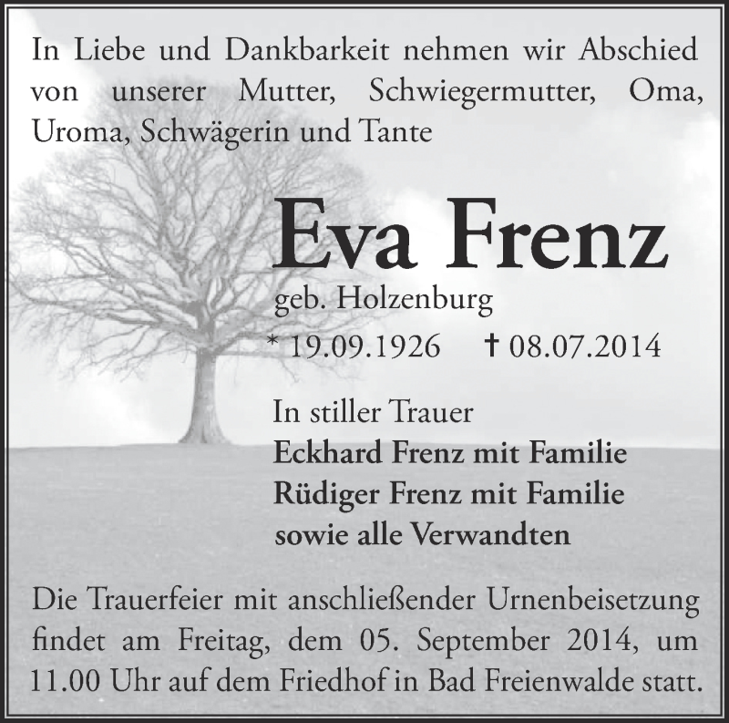 Hier finden Sie alle Traueranzeigen aus der Zeitung, die bisher für Eva Frenz erschienen sind. Weitere Traueranzeigen, die in der Zeitung erscheinen, werden hier ebenfalls aufgelistet