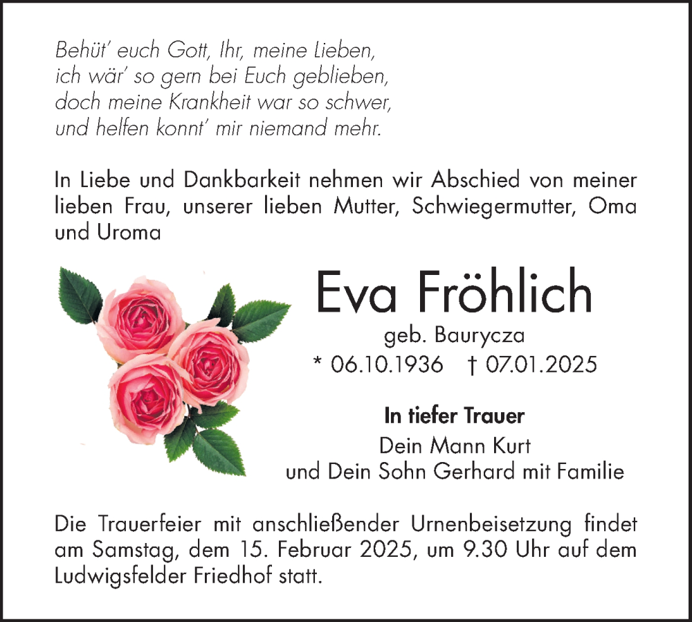 Hier finden Sie alle Traueranzeigen aus der Zeitung, die bisher für Eva Fröhlich erschienen sind. Weitere Traueranzeigen, die in der Zeitung erscheinen, werden hier ebenfalls aufgelistet