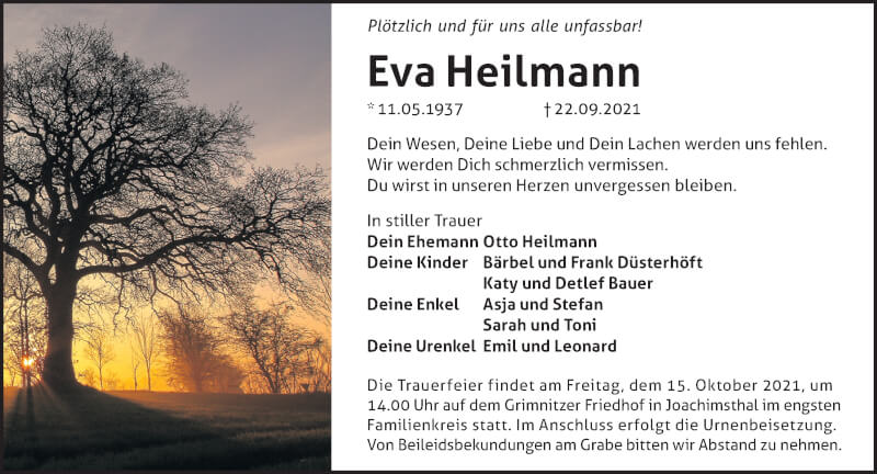 Hier finden Sie alle Traueranzeigen aus der Zeitung, die bisher für Eva Heilmann erschienen sind. Weitere Traueranzeigen, die in der Zeitung erscheinen, werden hier ebenfalls aufgelistet