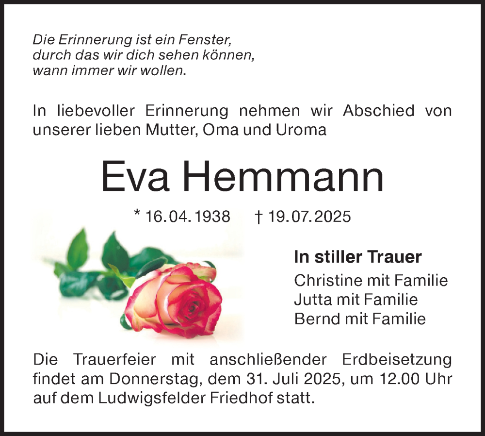 Hier finden Sie alle Traueranzeigen aus der Zeitung, die bisher für Eva Hemmann erschienen sind. Weitere Traueranzeigen, die in der Zeitung erscheinen, werden hier ebenfalls aufgelistet