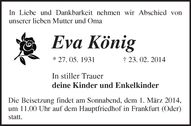 Hier finden Sie alle Traueranzeigen aus der Zeitung, die bisher für Eva König erschienen sind. Weitere Traueranzeigen, die in der Zeitung erscheinen, werden hier ebenfalls aufgelistet