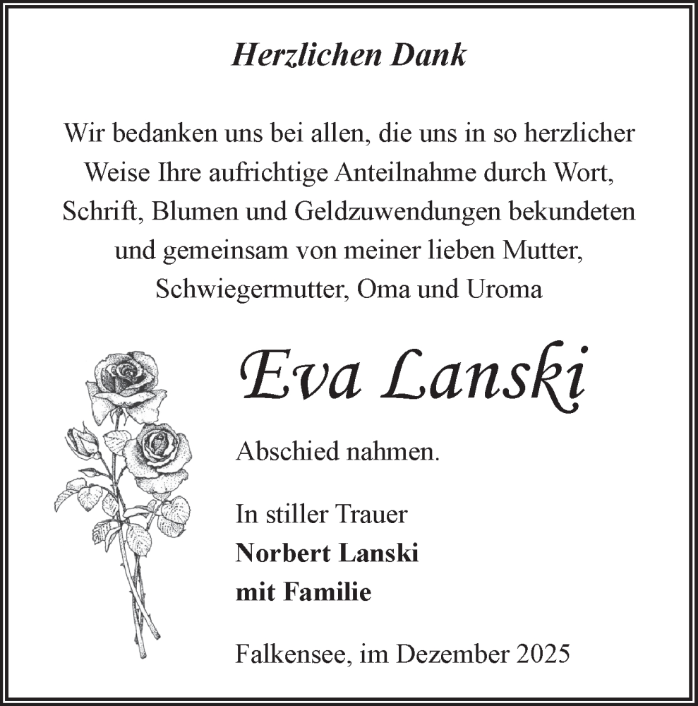 Hier finden Sie alle Traueranzeigen aus der Zeitung, die bisher für Eva Lanski erschienen sind. Weitere Traueranzeigen, die in der Zeitung erscheinen, werden hier ebenfalls aufgelistet