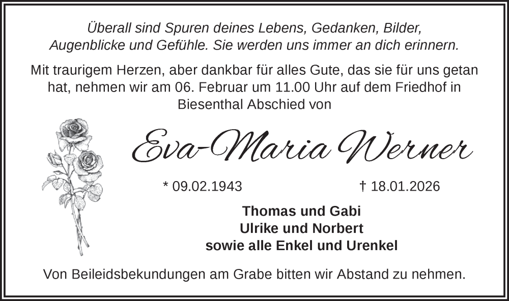 Hier finden Sie alle Traueranzeigen aus der Zeitung, die bisher für Eva-Maria Werner erschienen sind. Weitere Traueranzeigen, die in der Zeitung erscheinen, werden hier ebenfalls aufgelistet