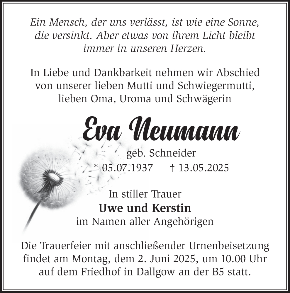 Hier finden Sie alle Traueranzeigen aus der Zeitung, die bisher für Eva Neumann erschienen sind. Weitere Traueranzeigen, die in der Zeitung erscheinen, werden hier ebenfalls aufgelistet