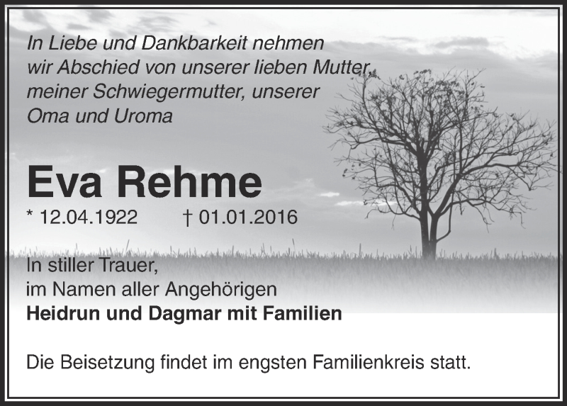 Hier finden Sie alle Traueranzeigen aus der Zeitung, die bisher für Eva Rehme erschienen sind. Weitere Traueranzeigen, die in der Zeitung erscheinen, werden hier ebenfalls aufgelistet