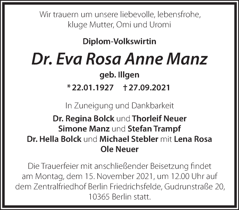 Hier finden Sie alle Traueranzeigen aus der Zeitung, die bisher für Eva Rosa Anne Manz erschienen sind. Weitere Traueranzeigen, die in der Zeitung erscheinen, werden hier ebenfalls aufgelistet