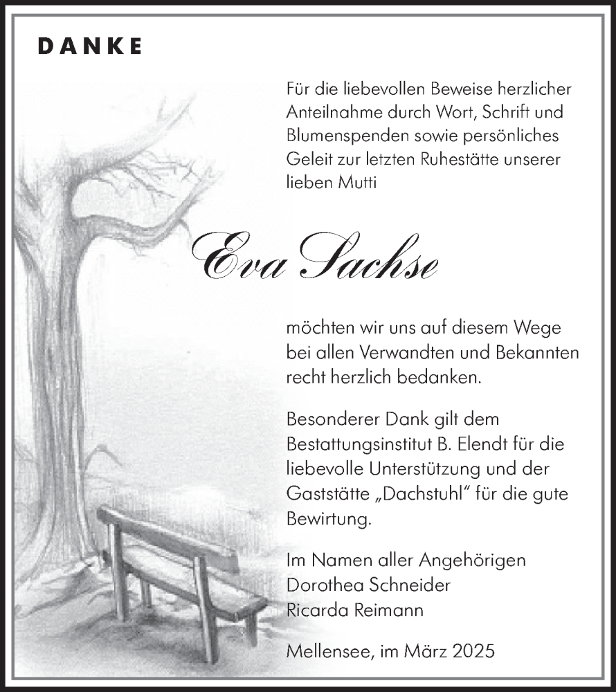 Hier finden Sie alle Traueranzeigen aus der Zeitung, die bisher für Eva Sachse erschienen sind. Weitere Traueranzeigen, die in der Zeitung erscheinen, werden hier ebenfalls aufgelistet