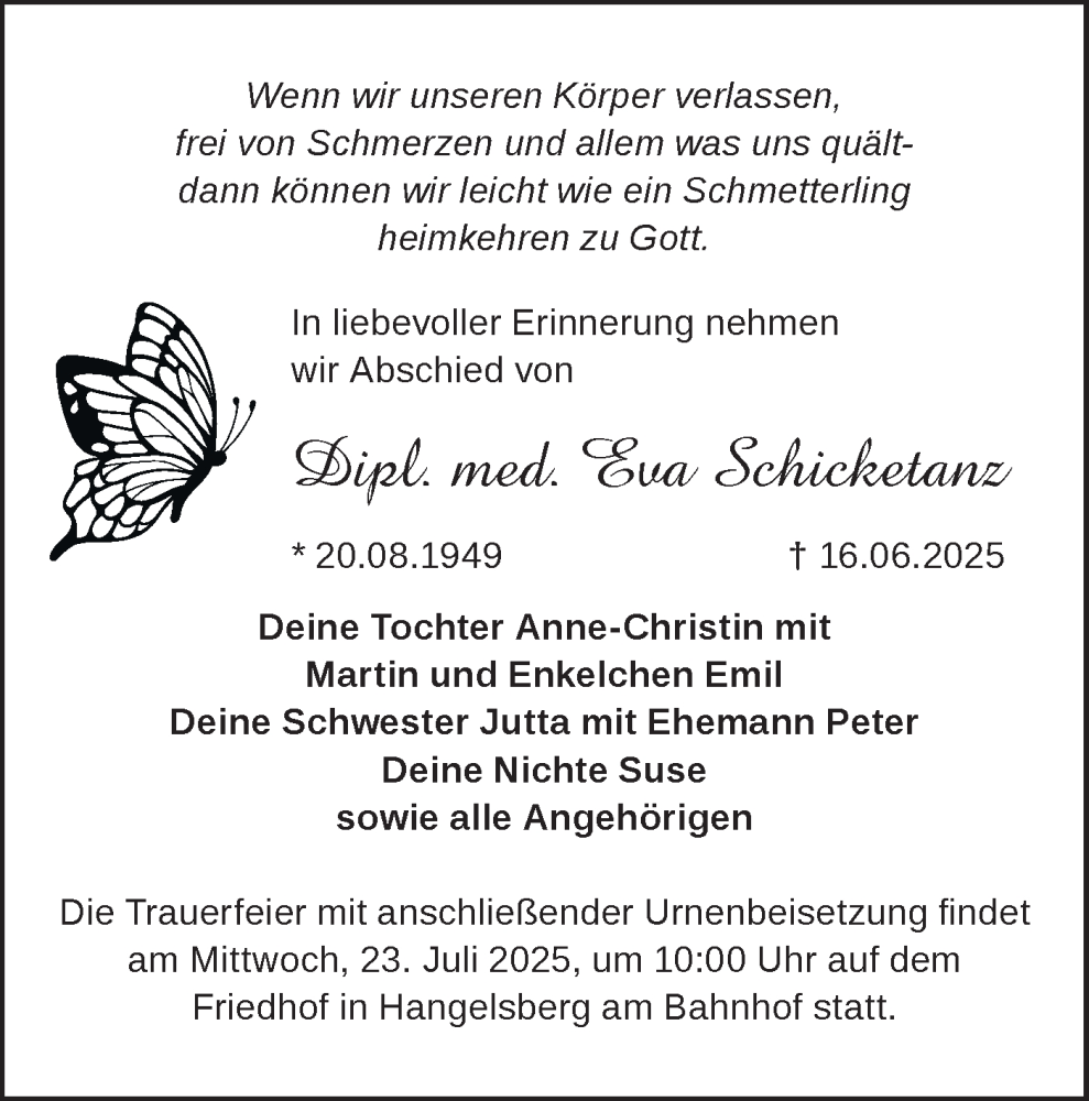 Hier finden Sie alle Traueranzeigen aus der Zeitung, die bisher für Eva Schicketanz erschienen sind. Weitere Traueranzeigen, die in der Zeitung erscheinen, werden hier ebenfalls aufgelistet
