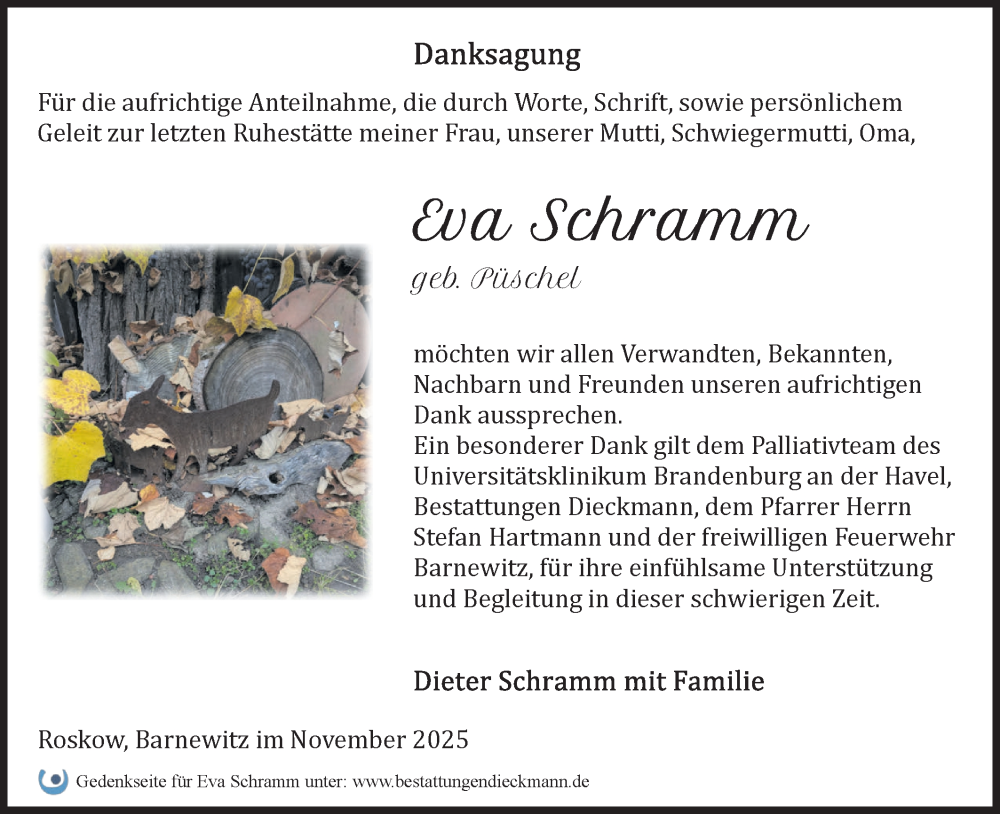 Hier finden Sie alle Traueranzeigen aus der Zeitung, die bisher für Eva Schramm erschienen sind. Weitere Traueranzeigen, die in der Zeitung erscheinen, werden hier ebenfalls aufgelistet