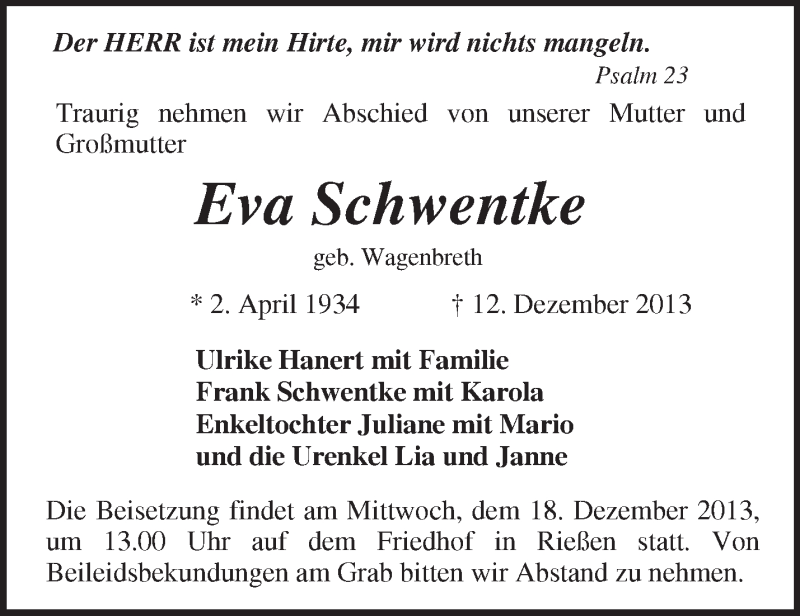 Hier finden Sie alle Traueranzeigen aus der Zeitung, die bisher für Eva Schwentke erschienen sind. Weitere Traueranzeigen, die in der Zeitung erscheinen, werden hier ebenfalls aufgelistet