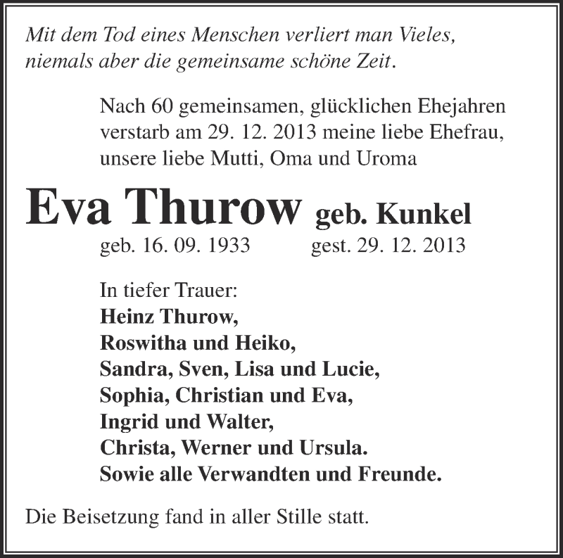 Hier finden Sie alle Traueranzeigen aus der Zeitung, die bisher für Eva Thurow erschienen sind. Weitere Traueranzeigen, die in der Zeitung erscheinen, werden hier ebenfalls aufgelistet