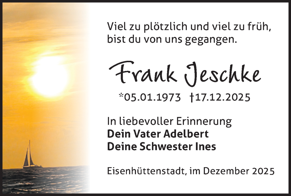 Hier finden Sie alle Traueranzeigen aus der Zeitung, die bisher für Frank Jeschke erschienen sind. Weitere Traueranzeigen, die in der Zeitung erscheinen, werden hier ebenfalls aufgelistet