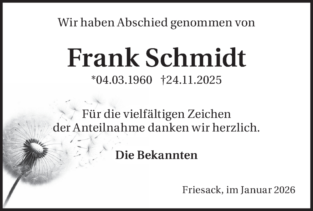 Hier finden Sie alle Traueranzeigen aus der Zeitung, die bisher für Frank Schmidt erschienen sind. Weitere Traueranzeigen, die in der Zeitung erscheinen, werden hier ebenfalls aufgelistet
