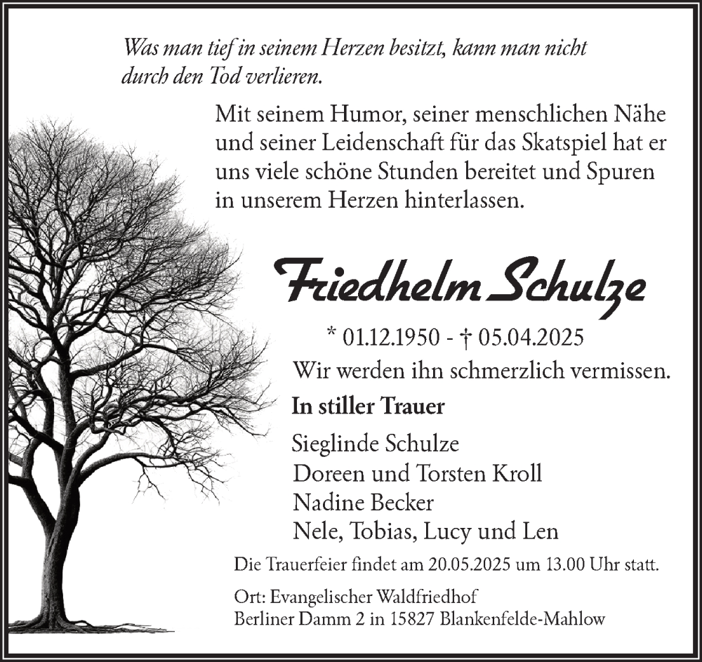 Hier finden Sie alle Traueranzeigen aus der Zeitung, die bisher für Friedhelm Schulze erschienen sind. Weitere Traueranzeigen, die in der Zeitung erscheinen, werden hier ebenfalls aufgelistet